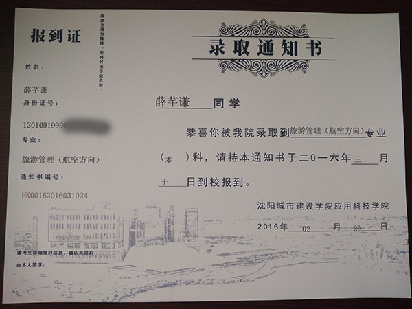 恭喜薛芊谦同学被我校录取【沈城建航空】